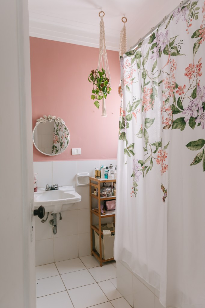 Y es cuestión de preguntarse qué necesita. Si su habitación es este “templo”, y tiene una sutileza que se completa con una escultura de Marinés Agurto, una orquídea y sus libros favoritos, su baño tiene una energía muy distinta. El hall verde contrasta con el interior rosa, hay plantas colgando, una cortina de baño floral y divertida… Los elementos son más atrevidos y estimulantes. Lo pensó como para despertarse apenas entre y continuar su día.