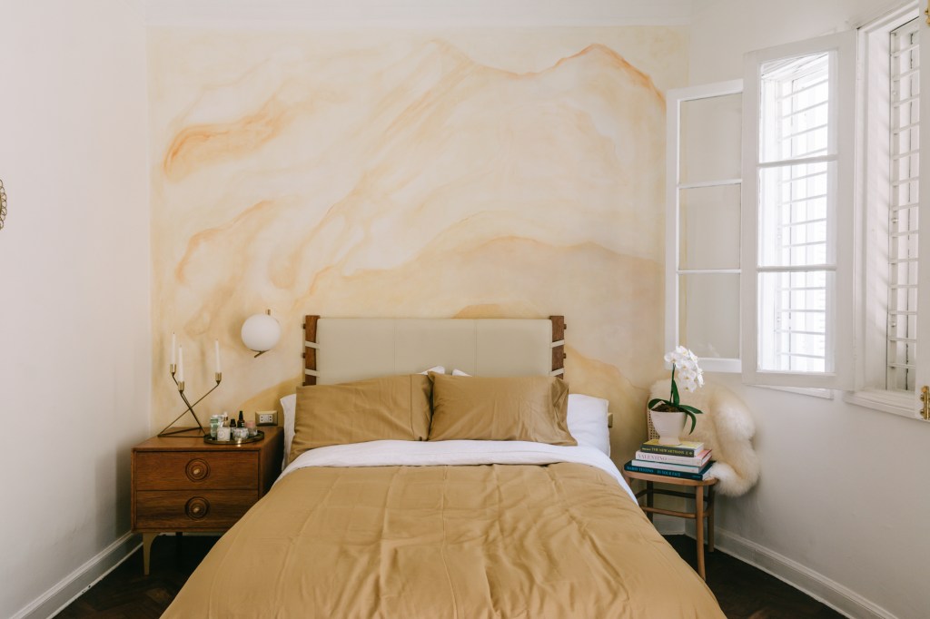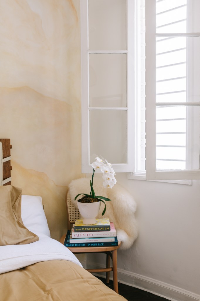 Su dormitorio es grande: la pared curva le da una dimensión especial y la luz de la calle entra limpia. Desde el balcón, puede verse un poquito de El Olivar. Sin embargo, todo estaba muy blanco, Yahel necesitaba algo más de calidez. Colgó una lámpara de tamshi (una liana de la Amazonía) y una alfombra con diseños tribales, además del gran espejo con marco de madera, y los acentos en colores tierra y ocre le empezaron a dar una sensación entre rústica y sutil al cuarto. Yahel quería hacer algo más, algo distinto. Le pidió a la muralista e ilustradora Ana Balcázar que intervenga su pared de cabecera con acuarela, a mano, en un tono naranja muy bajito: el resultado es un mural de formas muy orgánicas que encienden el espacio y llevan a Yahel tanto al fondo del mar como a un sunset maravilloso.