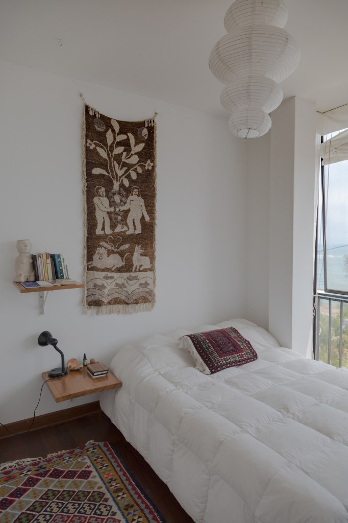 Así como el textil la acoge, el color la tranquiliza. La hace sentirse en casa. Para Mozhdeh, tener puntos de color traen alegría y luz. Igual procura ser cuidadosa con los tonos: por ejemplo, no podría habitar un espacio que tenga una pared roja… Aunque confiesa que está pensando en pintar alguna pared de azul, si bien no se termina de animar. Mi cuarto es el ambiente más neutro, blanco y azul, solo la alfombra enciende las cosas un poquito. El cubrecamas, la cómoda, la cortina son blancas. Y es que este es el lugar donde descansa su vista y su mente. Le gusta despertar limpio. Empezar de cero cada día.