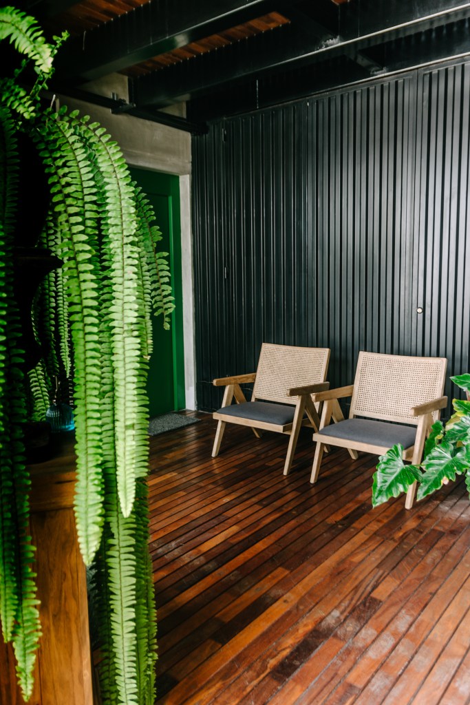 El tríplex se despliega verticalmente, pero además cuenta con unas miniterrazas que surgieron gracias a la buena relación entre los vecinos del edificio. Se pusieron de acuerdo para transformar el hall de entrada a cada departamento en un área común con sillas, lleno de verde. Así, todos los depas ganan espacio adicional al aire libre, con una vista linda, donde pueden leer, tomar una copa, descansar. Estas terracitas se cuidan entre todos.