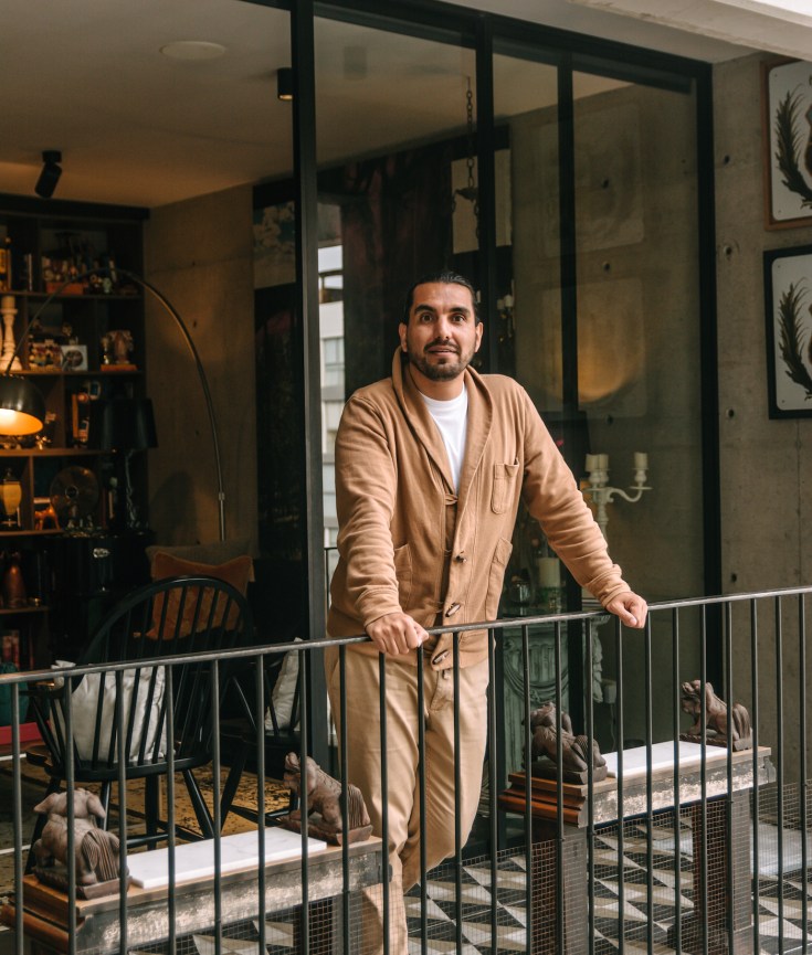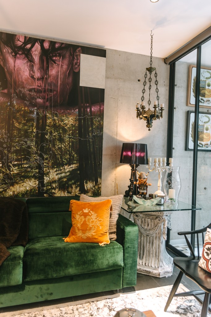 Cal ha ubicado el arte en lugares poco convencionales. En el muro de las escaleras los cuadros están muy juntos; en ambientes como la sala principal o la segunda sala en la planta superior hay piezas que destacan más. Incluso ha aprovechado las vigas para colgar piezas. El recibidor tiene varias obras y, además, está cubierto por un papel tapiz recargado, a pesar de ser un espacio muy pequeño. A Cal le daba algo de miedo que no se viera bien pero luego pensó que esta es su casa: había que probar porque, al final, si algo no funciona simplemente se cambia.