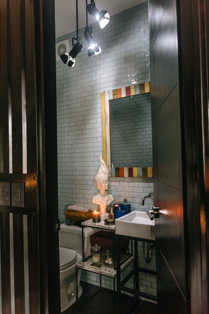 En su depa, sala, comedor y cocina ocupan un solo espacio abierto, así que la nueva disposición de la luz le ayudó a delimitar ambientes. Sobre la mesa, puso una lámpara baja que ilumina específicamente su superficie. En la cocina, la luz original estaba empotrada en el techo y no iluminaba lo suficiente como para cocinar con buena visibilidad. Así que Cal agregó iluminación superior, además de las lámparas de la barra, para poder jugar con el mood pero no perder funcionalidad.
