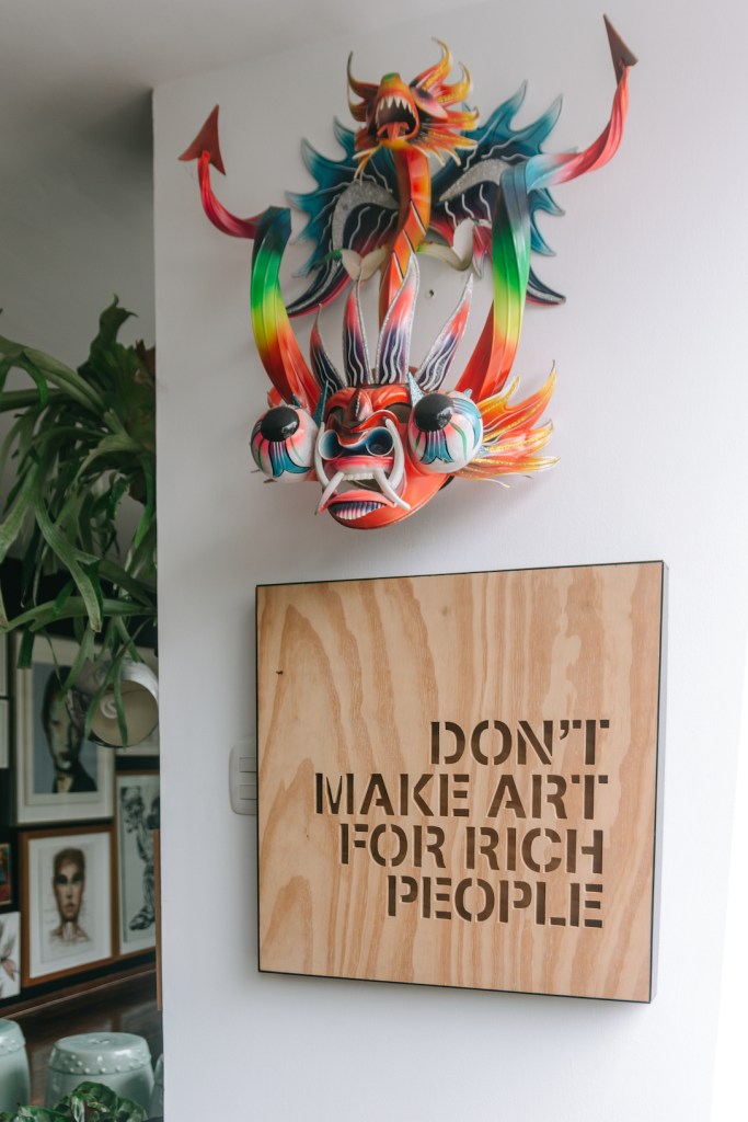 En la cocina, conserva un colorido altar cargado de elementos simbólicos. Es en este ambiente donde pasa más tiempo, sin lugar a dudas. “Tengo un déficit de atención muy, pero muy alto; y este es el espacio donde puedo encontrar el pretexto perfecto para estarme moviendo todo el tiempo”, acota. Por eso, le resulta muy cómodo organizar las reuniones con su equipo de trabajo ahí mismo, inspirarse o simplemente disfrutar del acto de preparar y compartir los alimentos.