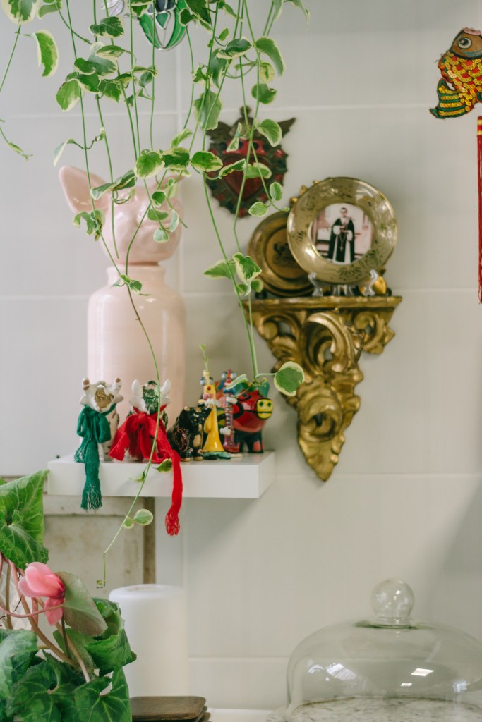 Cachivachero como se define, uno de sus elementos favoritos es, por ejemplo, una urna con la imagen de Santa Filomena, mártir de la Edad Media con la que lo conecta una anécdota de viajes y casualidades del destino. Luego, está el retrato que hizo Adriana Tomatis de su abuela, regalos que le han hecho sus amigos y decenas de objetos chiquitos, cada uno con su propia historia. Es interesante el vínculo que mantiene con las cosas, ya que no está netamente asentado en lo material, sino también –y, principalmente– se relaciona con las personas que estos objetos representan. Por esta misma razón, en realidad, nunca está solo.