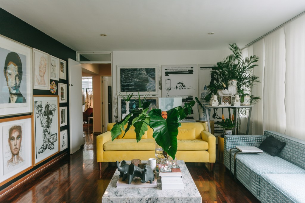 Este edificio de siete décadas es el lugar en el que más tiempo ha estado; siete años, para ser exactos. Se siente muy cómodo viviendo y trabajando en este depa. Si bien mucha gente cree que el hogar debe ser un santuario de tranquilidad y espacio personal, para Amaro, ese no es el caso. “Aquí vivo, trabajo, recibo a mis clientes, despacho con mi equipo, tenemos reuniones, es la guarida del club. Si alguien tiene un cumpleaños, lo celebramos acá; si nadie tiene qué hacer, vienen”. El diseñador describe su propio hogar como un “espacio transitorio permanente”, en el que, por más que básicamente vivan solo él y Ramón, su perro, siempre hay gente. La casa está constantemente llena.
