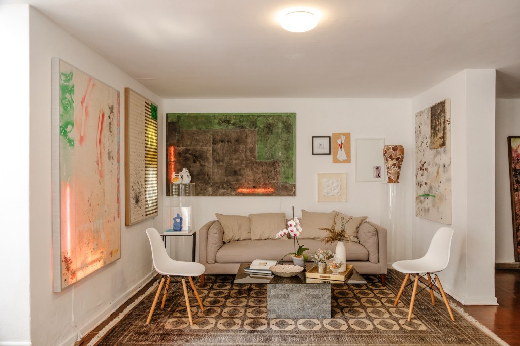 Al final del día, cuando se encuentran nuevamente, comparten en el pequeño estar del segundo piso, donde ven tele y se relajan un rato antes de ir a dormir. Si les provoca tomar una copa, prefieren la sala principal, en la que pueden simplemente conversar y contemplar la forma que ha ido tomando su casa. “Ignacio es el ‘máster’ de las paredes”, reflexiona Uchi mientras mira uno de los cuadros retroiluminados de la sala. Él se encarga del arte, ya que este es, además de su casa, un espacio de exposición de su propia obra, así como la de artistas amigos.
