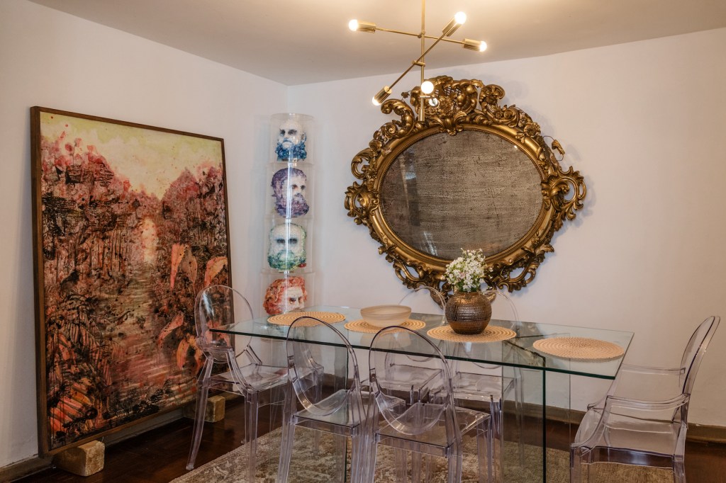 Las piezas del mobiliario han sido elegidas en conjunto, otras perviven desde su época de solteros, y algunas más son herencias o regalos de boda. A Uchi no le gustaba mucho el comedor porque no recibe luz natural; así que optaron por ponerle una gran luminaria colgante y un juego de muebles en acrílico transparente. De esta manera, han creado el entorno que va bien con su forma de vivir y de pensar. Por eso, solo sentarse y mirar es suficiente.