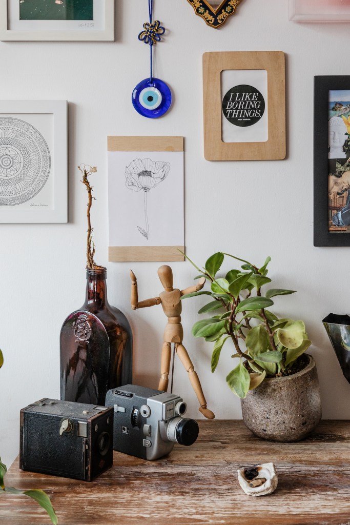 La casa es amplia; tiene suficiente espacio para que ambos desplieguen su creatividad en solitario, pero también para pasarlo bien en conjunto. En el primer piso, junto al patiecito donde suceden las parrilladas con amigos e Ignacio se imbuye en la jardinería, está el pequeño estudio en el que Uchi puede hacer sus sesiones de fotos y trabajar en equipo. En la segunda planta está la oficina de ella, cuya gran ventana le permite escaparse al techo para meditar cuando cae el sol. En pocos pasos se llega al taller de Ignacio, donde el tiempo transcurre de manera distinta, de esa forma peculiar que solo entienden los artistas.