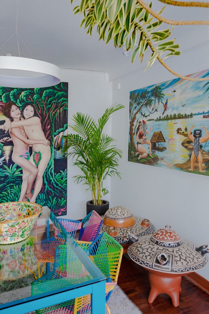 Entonces, en un primer momento el departamento se vistió con obra de Chonon Bensho, artista shipibo-konibo que acaba de ganar el Premio Nacional de Pintura del BCRP; de Pablo Amaringo, “el creador del arte visionario, quizás el artista amazónico más influyente de la historia”, acota Bendayán; piezas de Dimas Paredes, quien se concentra en las plantas medicinales de la Amazonía, y de Graciela Arias, inspirada en la mitología shipibo-konibo, entre otros artistas que lo acompañaron, rodearon y acogieron en su propia casa.