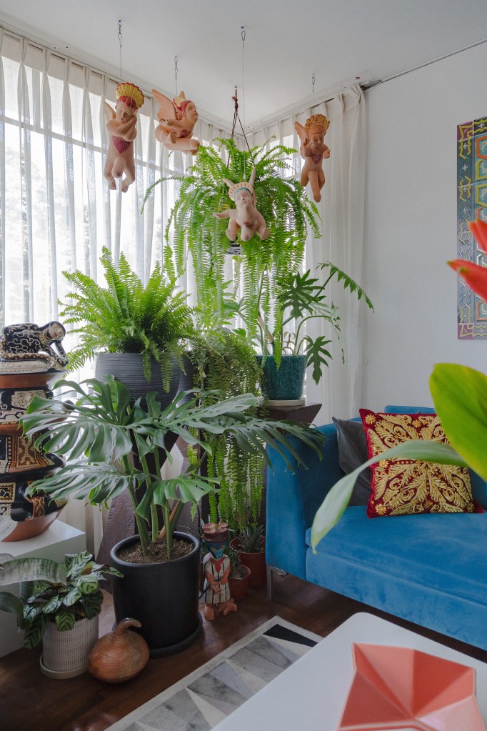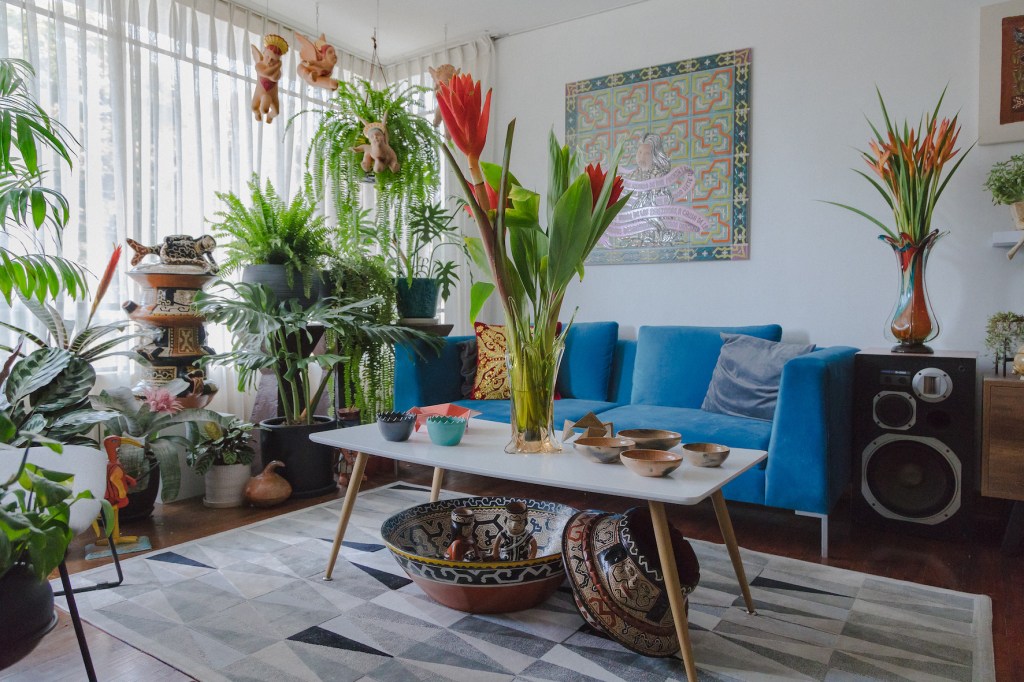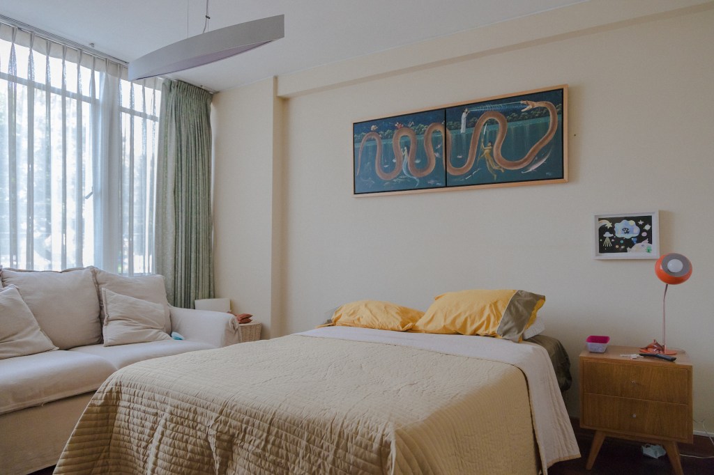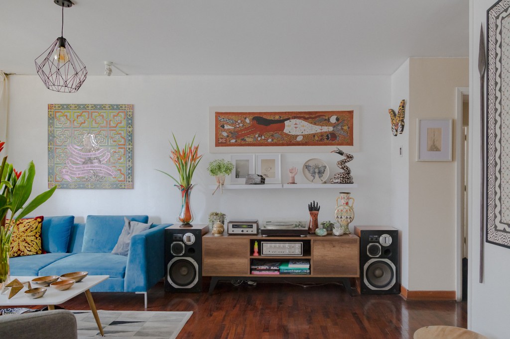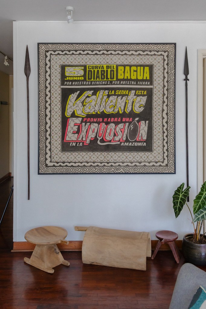 Lo más importante era distribuir sus obras de arte. El conocido artista visual, curador y gestor cultural tiene una gran colección de arte amazónico: al momento de mudarse, estaba trabajando en lo que sería su muestra en el marco de la Feria Internacional del libro de Guadalajara, y lo que hizo tan importante este nuevo departamento es que decidió rodearse de piezas que tuvieran que ver con ese momento en su proceso de creación.