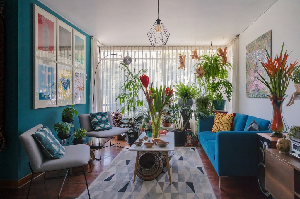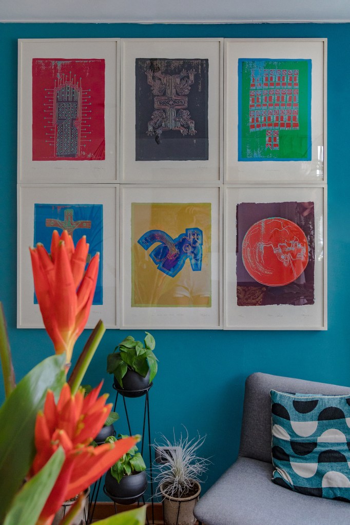 Hay constantes. El sofá y la pared turquesa. Ese es un color que acompaña la obra de Bendayán. Así como sucede con el fucsia. Por periodos los abandona, se vuelca a los sepias, los grises… pero terminan siempre apareciendo los tonos vibrantes. Así que al momento de ponerle color al depa, supo que el turquesa le daría tranquilidad (esa tranquilidad de lo familiar), y que cualquier cosa que él haya pintado o haya coleccionado iría bien con el color. Christian adquiere arte u objetos que le gustan mucho, que lo mueven.
