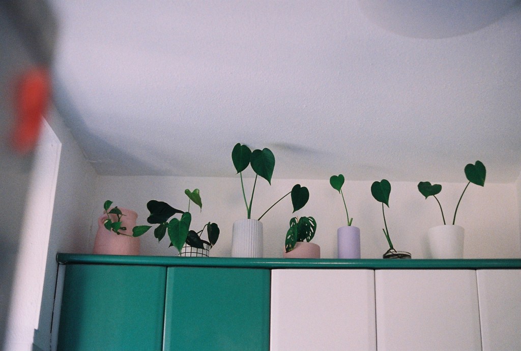 El espacio del salón y la cocina es el lugar favorito de la casa. Desde los balcones se ven los maravillosos atardeceres. “Muchas noches se convierte en el mejor bar de Madrid. Casi todo lo que hay en el salón son regalos de amigos que han ido llegado, la mayoría de los muebles vinieron con la casa, nosotros, sobre todo, hemos traído plantas”. Unos de los pasatiempos favoritos de Dora es hacer esquejes: “Mi planta favorita es la monstera, me encanta irlas reproduciendo, clonando… Ya están por toda la casa, las tengo en tierra y en agua”.