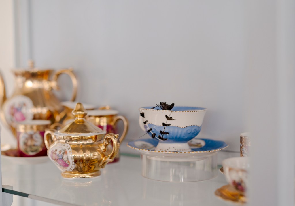 Junto a la sala se encuentra una vitrina que fue parte de una instalación de la artista Patricia Villanueva: está llena de objetos, una exhibición recargada que Claudia nunca se imaginó tener, ella que quería todo limpio. Su mamá falleció hace casi cuatro años y para Claudia es importante tenerla presente físicamente de alguna forma. Así que la vitrina muestra parte de la vajilla de su madre, junto con una taza de Patricia Villanueva -rota y cosida con plumas de cuervo- y un bordado de Ana Teresa Barboza, entre otras piezas. En la mesa de la sala tiene un adorno redondo, también de su madre, un objeto que siempre le gustó. Y en honor a ella, Claudia empezó a cuidar una orquídea. Su mamá las amaba y las tenía por toda su casa, todo el tiempo floreaban. Así lo recuerda Claudia.