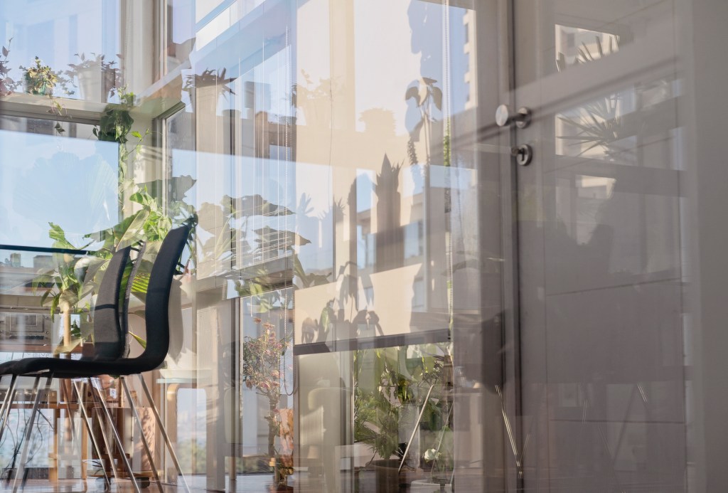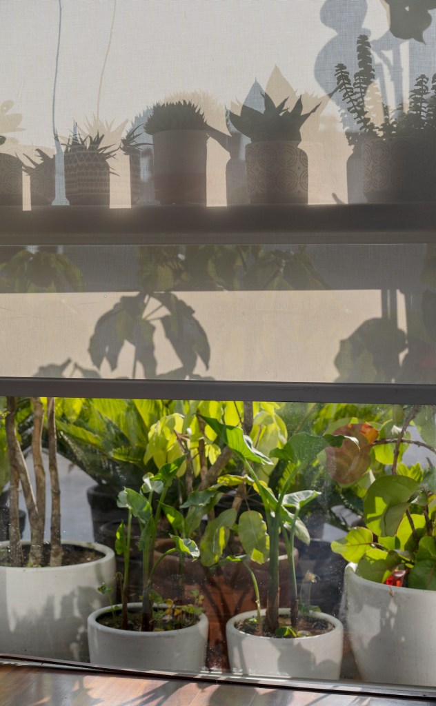 Por los cristales de lado a lado, hay una sensación de invernadero en el área social. Sin embargo, Claudia no lo vislumbraba como está ahora, lleno de plantas. De hecho, en su depa anterior tenían solo dos macetas. A la artista le gustan los objetos y muebles de diseño, pero no se permitía tener muchos elementos para no tener que cuidar que se rompan, ensucien o malogren. Por supuesto, no se imaginaba manteniendo plantas. Pero cuando vieron la terraza gigante, Hugo le dijo: “Creo que está muy vacía”. Ese fin de semana fueron al Mercado de flores de Barranco.