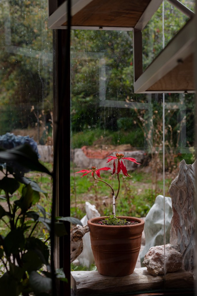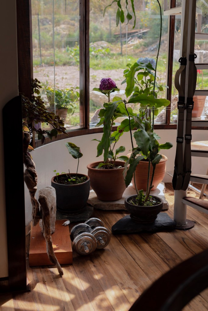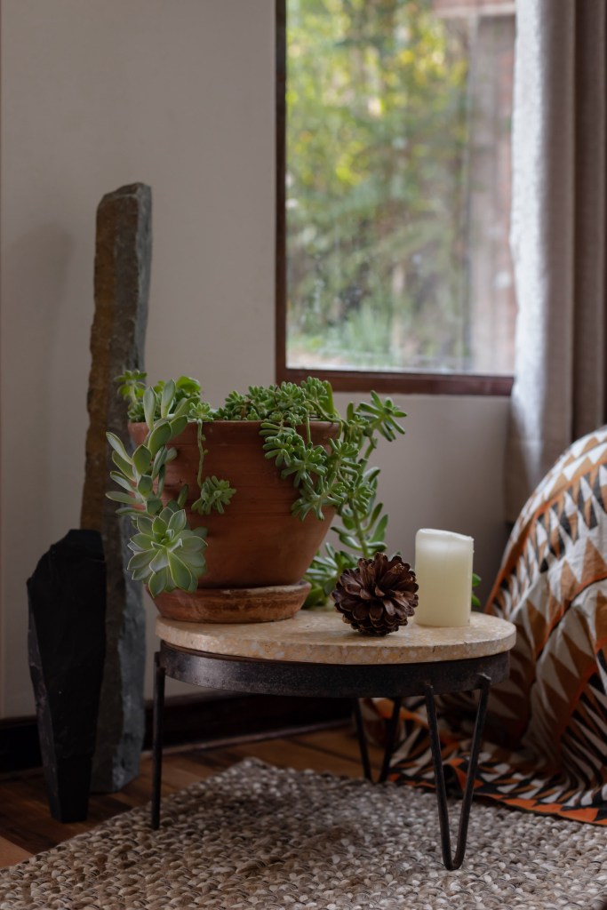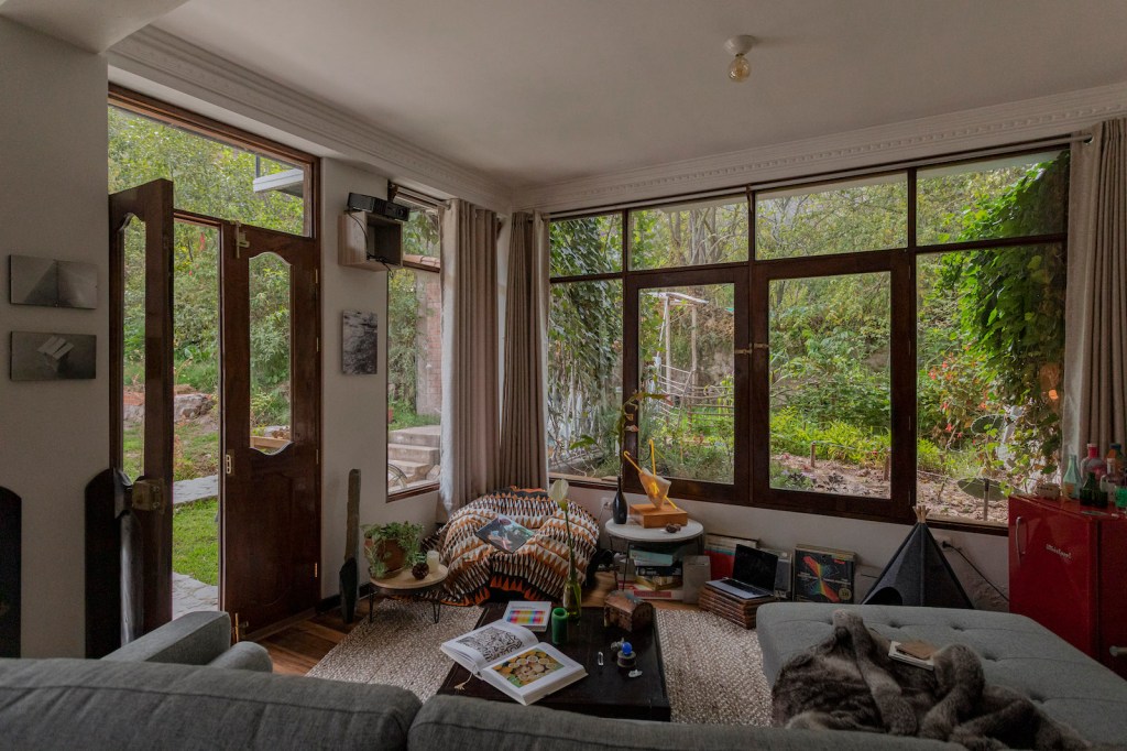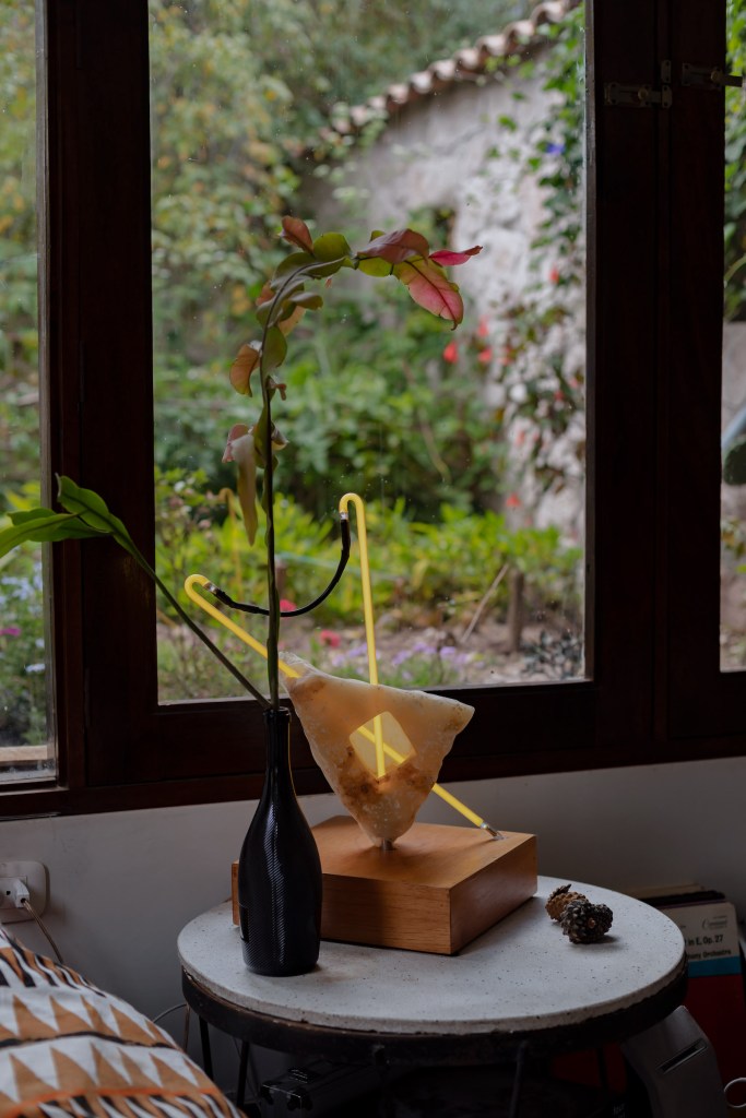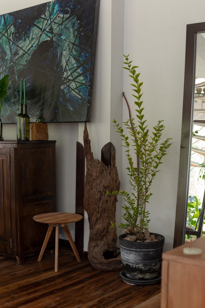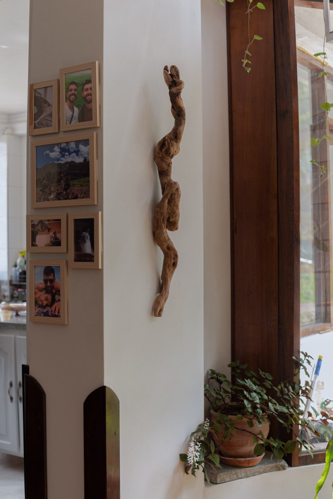 Nicolás es escultor. Aunque ahora mismo no está trabajando en su arte –pues no encuentra el espacio físico ni mental para crear como quisiera–, el entorno del Valle Sagrado le regala varias piezas naturales que él va curando y colocando en los ambientes. Piedras, troncos, raíces, cortezas, para él son como ready mades, no tiene que hacer nada más que encontrar el espacio perfecto para ellos en casa. “Mi familia es de Ica, yo he vivido en Chincha hasta los diez años. Digamos que he vuelto al campo”, cuenta.