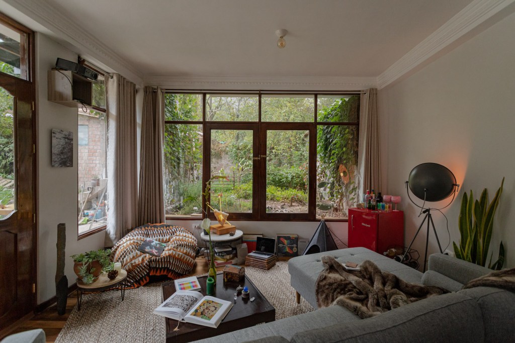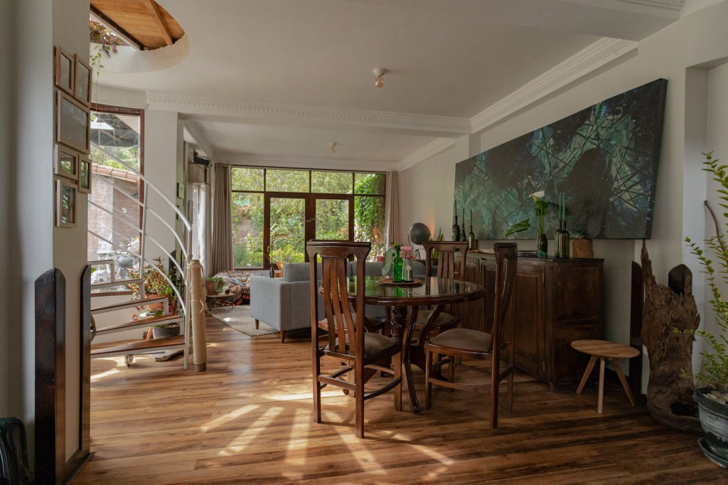 La casa es parte de un edificio dividido en pocos departamentos. El espacio que ellos ocupan tiene un primer nivel que constituye la zona social: la sala tiene vista al huerto; una escalera en semicírculo sube al segundo nivel, acompañada por el ventanal que ilumina toda la casa. Arriba, está el área privada con tres dormitorios. En un inicio pensaron en buscar roommates, pero luego decidieron que sería mejor vivir solos; además, siempre llegan amigos a quedarse de visita. A la pareja le encanta recibir gente; de hecho, ser anfitriones es una de las cosas que más les gusta de vivir en el Valle.