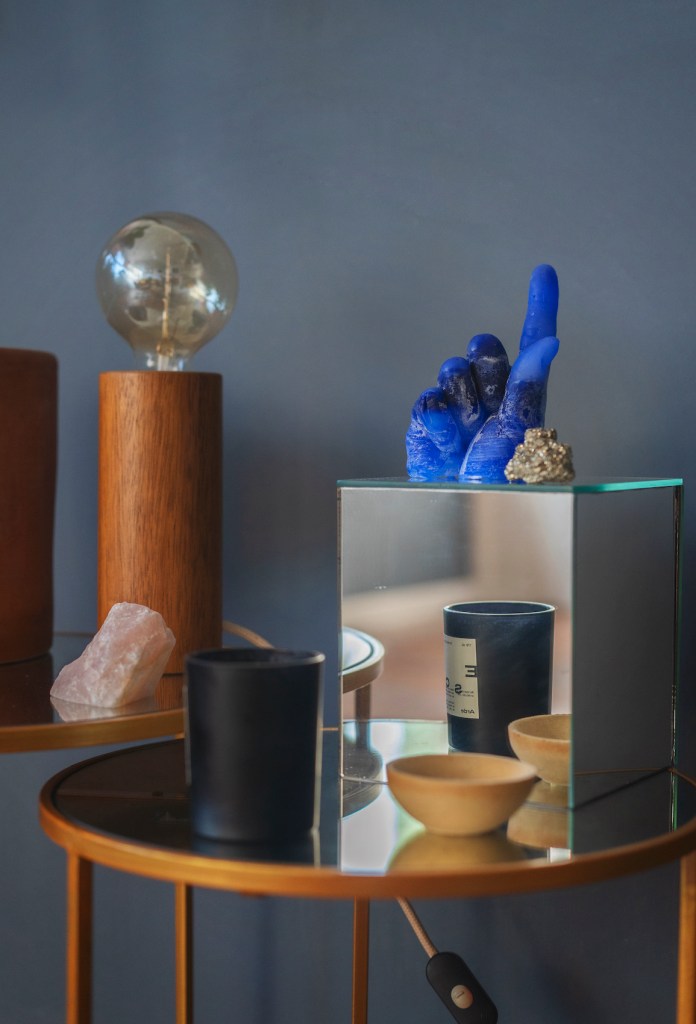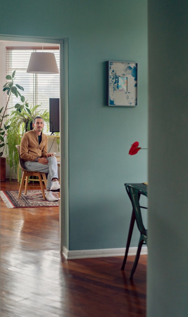A inicios de la pandemia, Juan Diego se mudó al depa de su novio, Renzo Merkt. Este año se trasladaron juntos al depa de Juan Diego. La primera noche que pasaron aquí, abrieron una botella de vino y la tomaron sentados en el piso de la sala: había que volver a armar todo. Renzo trabaja en Publicidad, su carrera está muy ligada a lo visual. El depa como está hoy, tiene muchos objetos de Juan Diego pero también varias cosas que han conseguido juntos: el sofá que eligieron, los cojines y las cerámicas de Tater Vera de su último viaje a Cusco. Ahora toman vino sobre la alfombra de Puna que Renzo trajo consigo.