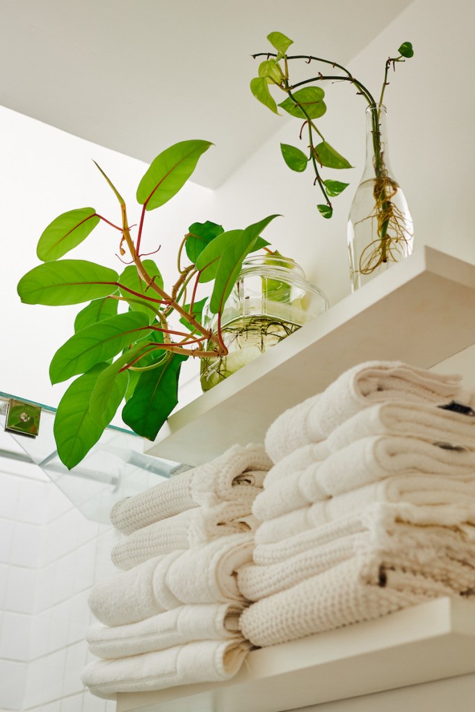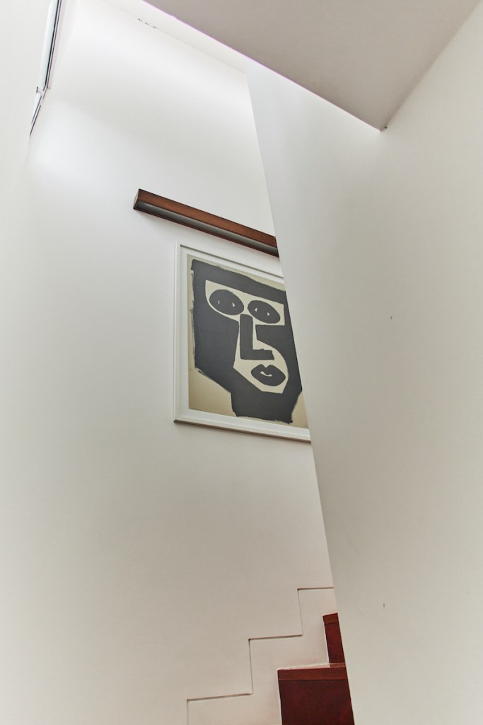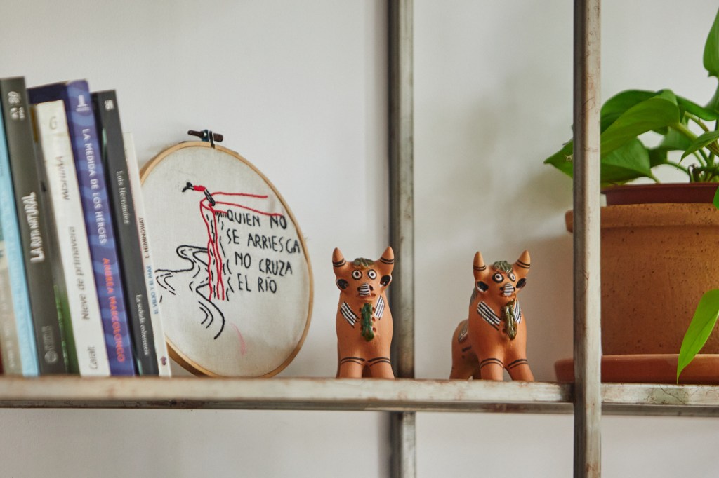 A la dueña de casa no le gustan los huecos en las paredes y dejó instaladas muchas repisas, sobre las cuales Carolina apoya sus adornos y piezas de arte. Le gustan las paredes llenas de cuadros pero siente que no van con ella. Además, está tratando de no acumular tantas cosas a su alrededor: ha usado este depa para empezar un poco de cero.