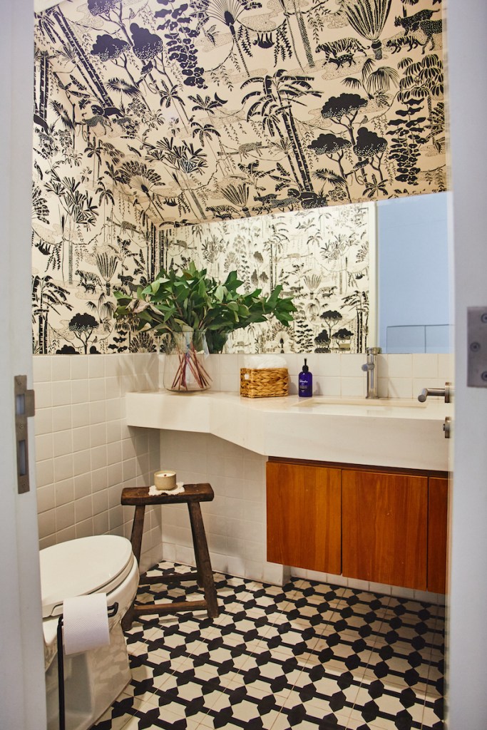 Trasladarse a este nuevo departamento ha sido como crecer, así lo siente ella. Es más grande, más de diseño, en muchos sentidos es una evolución. Pertenece a la amiga de su hermana y el depa vino con algunas cosas muy bonitas, como el papel tapiz del baño de visitas, las bancas de la barra de la cocina o la repisa de fierro en la sala. Antes de mudarse, Carolina sabía que los espacios habían sido hechos (y hasta entonces, vividos) con buen gusto y cariño.