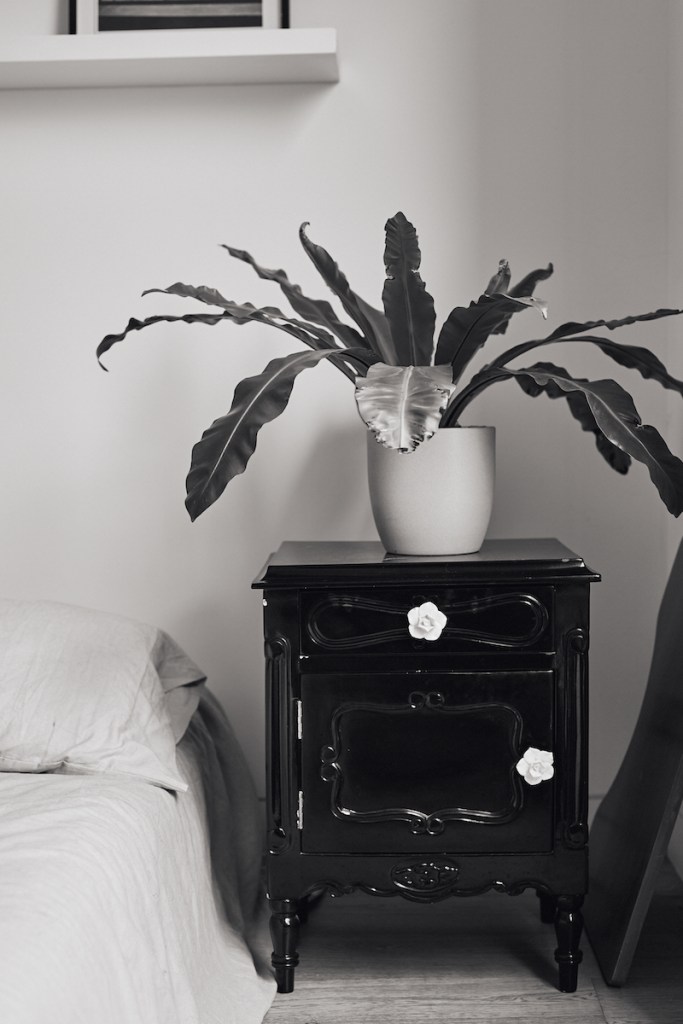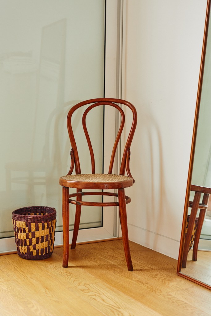Cree en el poder de reutilizar. En su dormitorio están la silla de esterillas que perteneció a su bisabuela, así como ese par de muebles que rescató de una fábrica. Suele comprar cosas de segunda pues llegan a ella con la energía de quienes las han tenido antes. Por eso respeta tanto la artesanía y el tejido: por esa impresión que deja la mano de la persona que los hace. Dice que no hay máquina que la pueda replicar.