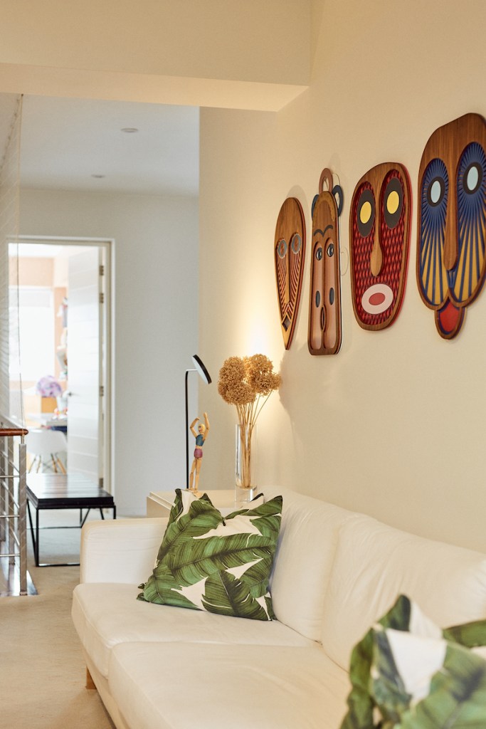 Simonetta piensa qué se llevaría si le toca otra mudanza: las lámparas, las máscaras que tiene en la pared y los cuadros, de seguro. Sabe que le costaría irse de esta casa. De las otras le costó menos, quizás porque nunca sintió que serían para siempre. En este depa han trabajado tanto, en todo sentido, para tenerlo como está. Y aún así, siente que no está terminado: todavía tiene pendientes varias renovaciones, como el papel tapiz del baño de invitados o la pared de la cabecera de su dormitorio. Mientras más marcas, novedades y diseño descubre, más se da cuenta de que las transformaciones importantes no se detienen nunca.