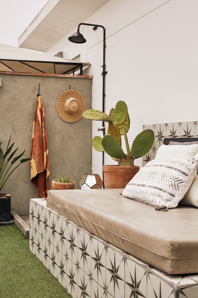Encontró este dúplex en el corazón de Miraflores: su tienda inicialmente estaba a unas pocas cuadras del lugar. Le identificó varias oportunidades al sitio: bien ubicado, con potencial para alquilar (en caso decidiera cambiarse de país), una terraza amplia. Antes de mudarse, reformó la cocina y los baños, ya que eran muy básicos para su gusto. Quería darle al lugar su toque, ese alegre y chispeante que la caracteriza. También puso el techo, que se asemeja al vidrio, sobre lo que hoy es una zona de tele y montó los primeros elementos de cómo luce la azotea hoy.