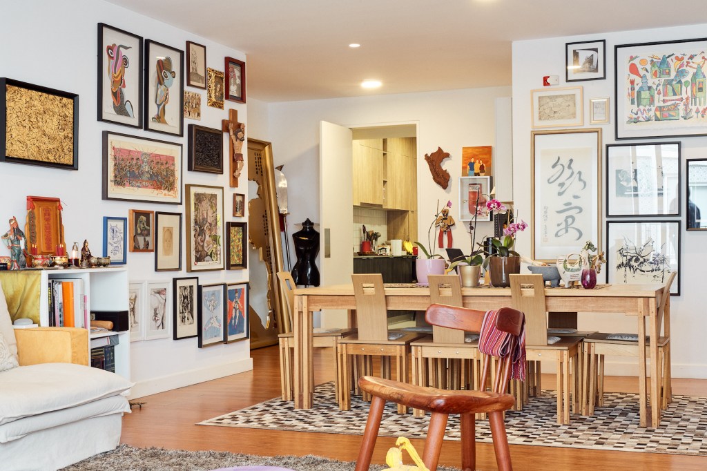 Sus paredes son un caso extraordinario de “un día dije ‘voy a poner cuadros’ y mira cuántos he terminado poniendo porque me iban gustando, porque me los regalaban o porque los rescataba de la casa de mi mamá”. Aunque él lo describe como espontaneidad, todo tiene una armonía que es tanto fascinante como curiosa de ver.