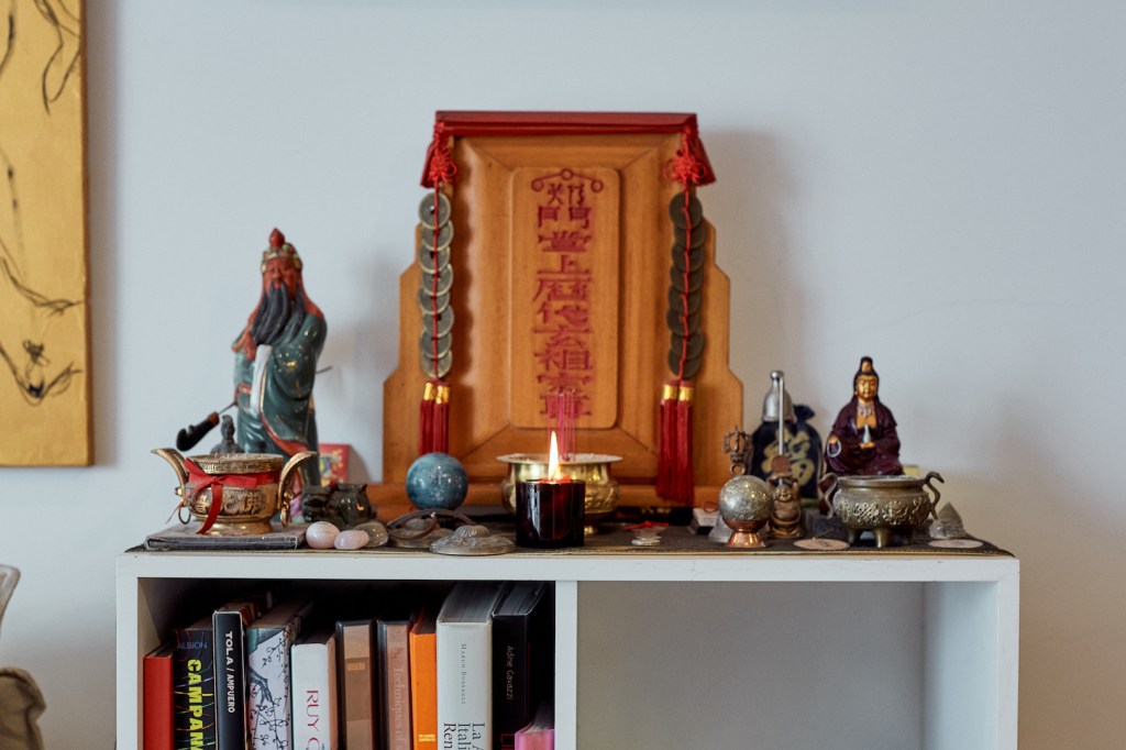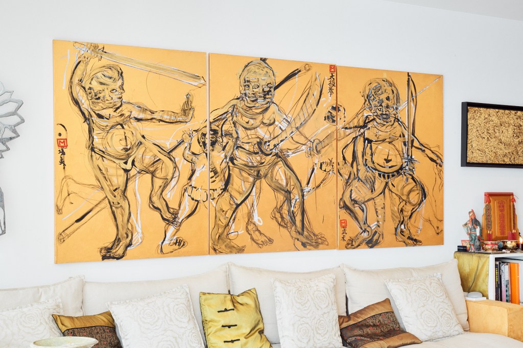 Álvaro o Akeón –su nombre chino y como lo conocen sus amigos cercanos– es un hombre de objetos: los diseña, los observa y los colecciona. En ese sentido, su sala se expande conforme más se mira. Una pieza central es el cuadro de Mateo Liébana en atípico negro y dorado, única en más de un sentido. “Le pedí un cuadro de sus personajes”, dice Álvaro antes de revelar que estamos frente a una suerte de retrato. “Las poses se las di yo, que entreno artes marciales. Le llevé el lienzo fondeado en dorado, para que solo dibuje en negro. Él al final le metió un poco más de tonos”.