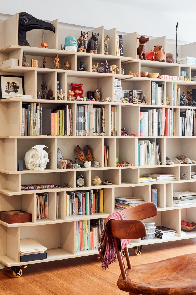 El librero se transformó ligeramente en la pandemia, cuando el diseñador le agregó ruedas. Los libros van rotando según los títulos nuevos que llegan, los que se regalan o los que necesita consultar diariamente. Este librero es la conjunción de muchos intereses unidos por un hilo conductor: entender la complejidad de los objetos únicos, como un pequeño robot que camina, la “Horma” de Jaime Liébana y una escultura de ojos de la artista Vacide Erda Zimic, por mencionar solo algunos.