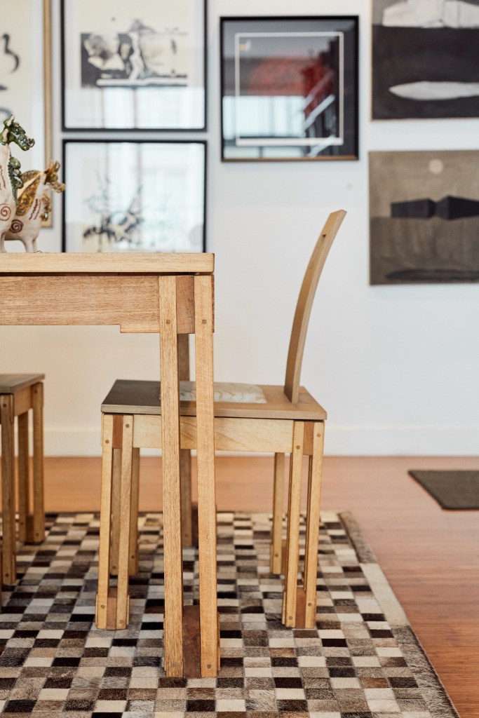 Como diseñador, las sillas han sido una gran pasión. Su conjunto de comedor surge de su visión de una silla china tradicional. Es una síntesis de lo clásico con una mayor geometría. De ahí sale la mesa, que diseñó con una elegante unión en cruz en las patas, simetría que combina con la alfombra de cuadros y piel de vaca. El ambiente es un espacio de evolución constante, y ya está pensando en hacerle algunas incrustaciones a la mesa que ejecutará en su minitaller casero.