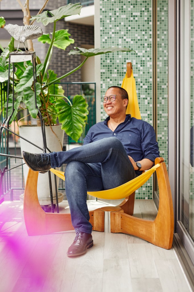 Si la sala es amplitud y comodidad, el balcón es un espacio de luz y de intimidad con el vecindario. El espacio lo define una de sus sillas: diseñada en madera y lona con un centro de acero es punto favorito para él y para su hija durante los días de sol o las noches de luna llena.
