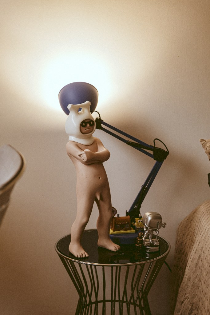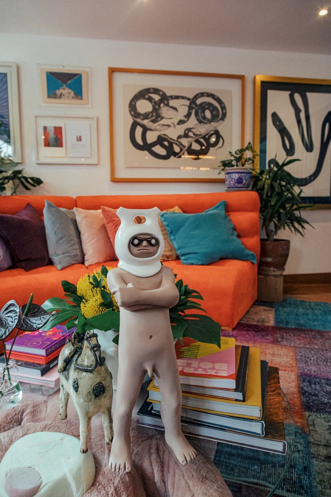 A lo largo del depa está su colección de arte en formación. Abel Bentín enmarcado en pan de oro; serigrafías que son regalos de sus alumnos y un cuadro central de Emperatriz Placido, quien también fue su estudiante; una escultura de Jorge Maita, de quien le atrae su exploración de los héroes y la peruanidad. Tiene un Mao de Alfredo Márquez, el lego diablada de Diego Lau (también su exalumno), un cuadro pequeño de Jorge Cabieses y papas de Restrepo. Entre todo, una firma enmarcada llama la atención: “Sé que nunca voy a poder comprarme una obra de Julia Navarrete, pero tengo esta pieza con una firma suya, así que enmarcarla y ponerla en mi pared termina siendo un chiste privado que me hace feliz”, explica.