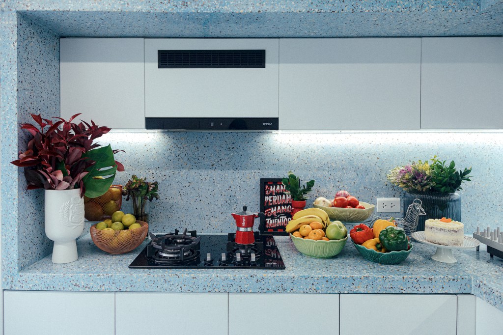 En la cocina pasó algo similar. Los cambios estructurales no fueron sencillos, pero sí claros. En lugar de tener una separación entre cocina y lavandería, tiene un espacio abierto y luminoso, que permite que Edward y Giancarlo cocinen juntos los domingos. La línea blanca está oculta y la luz natural que entra por la amplia ventana se refleja sobre el terrazo azul puesto en los reposteros que, por cierto, fue complicado poner en la parte superior pues su idea inicial no había contemplado la gravedad. Armaron el terrazo en una superficie plana y cuando secó lo aplicaron arriba. Una solución para todo.