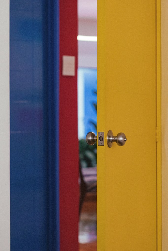 El amarillo es su color favorito, así que lo quiso en su dormitorio. No solo la puerta es amarilla, también la visible división entre la zona de descanso y la oficina, que comparten esa misma habitación. Para que una mesa larga atraviese todo el espacio, se tuvieron que cambiar de sitio la puerta al baño privado y el caño.