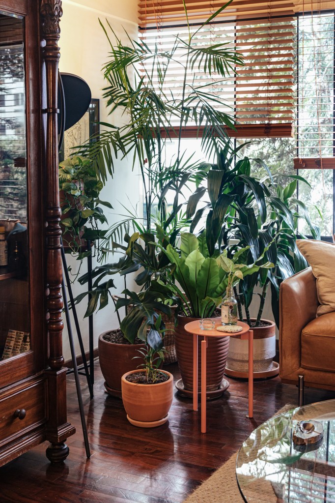 Las plantas están presentes en los distintos ambientes, todas de gran tamaño y verde intenso. Antes de mudarse, Andrés vivió un tiempo con amigas amantes de las plantas y eso le dio otra perspectiva, aunque no lo hizo experto en el cuidado de jardines interiores. A pesar de sus dudas, hasta el momento todas viven.