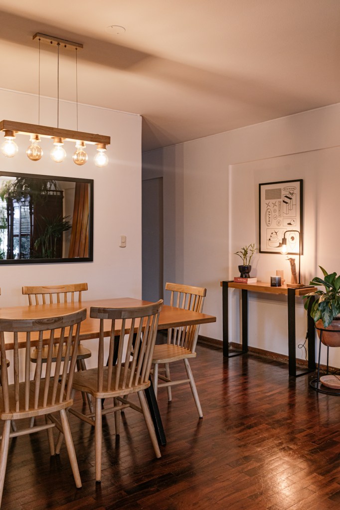 Junto a la mesa se quedaron el bar y el baúl, que también habitaban el departamento. Andrés quería tener objetos antiguos mezclados con lo nuevo. El estante de la sala donde están las plantas fue mandado a hacer para dar el tono al resto del espacio: combina fierro y madera, como también lo hacen la mesa que eligió para la entrada y el juego de comedor, con las patas de los muebles negros. La mesa de comedor es sobre todo una mesa de buraco, aunque también permite otros juegos como cachito o Pictionary. El espejo termina de definir un espacio de líneas limpias, solo interrumpido por la volatilidad de las plantas que crecen enmarcando retratos familiares, también vestigios de la decoración anterior pero definitivamente algo elegido por Andrés.