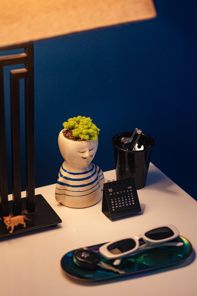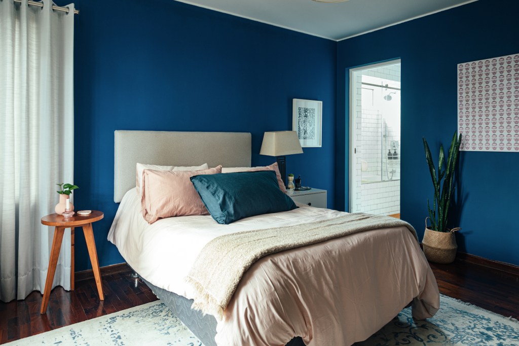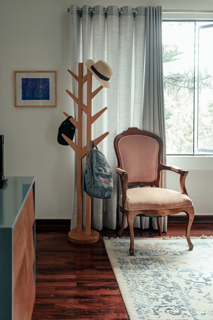 Para su habitación eligió colores que, considera, dan calma. Aunque no es mucho de alfombras, esta sugerencia le encantó. Decoran la estancia los cuadros de Rodrigo La Hoz y Luciana Tudela. Una sanseviera, esa planta que alguien le dijo que “atrapa las malas energías”, completa el cuarto.