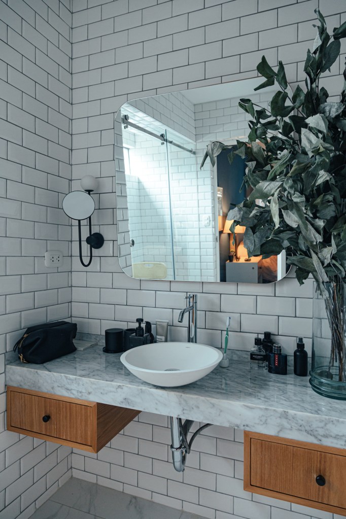 Conectado al dormitorio, su baño es el último espacio que remodeló, esta vez de la mano de su amigo el arquitecto Hans Klinge. Fue producto de compartir ideas y descubrir juntos cosas que a veces no te das cuenta hasta que las ves funcionando. Todo está a un nivel de fácil acceso: el caño es bajo, el espejo está inclinado para que se pueda ver de cuerpo completo. “Si quiero alquilar algún día esta casa no sé qué voy a hacer”, ríe Andrés. “Pero es exactamente lo que yo necesitaba… y se siente bien tener una casa hecha para ti”.
