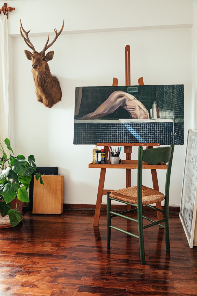 Aunque le gustaría decir que pasa más tiempo en su estudio, su lugar habitual es la sala, donde hay obras de Valentina Maggiolo, Muriel Holguín y un cuadro suyo, que define el centro del espacio. Es de su primera exposición individual, llamada “Amateur”, aunque el cuadro en sí mismo no tiene nombre. “No les pongo nombre en general porque no quiero encasillar la situación. Siempre trato de que sean cuadros muy grandes, en los que te sientas un poco metido, como si estuvieras adentro. Siempre hay una historia y me gusta que el espectador se la invente”, explica.