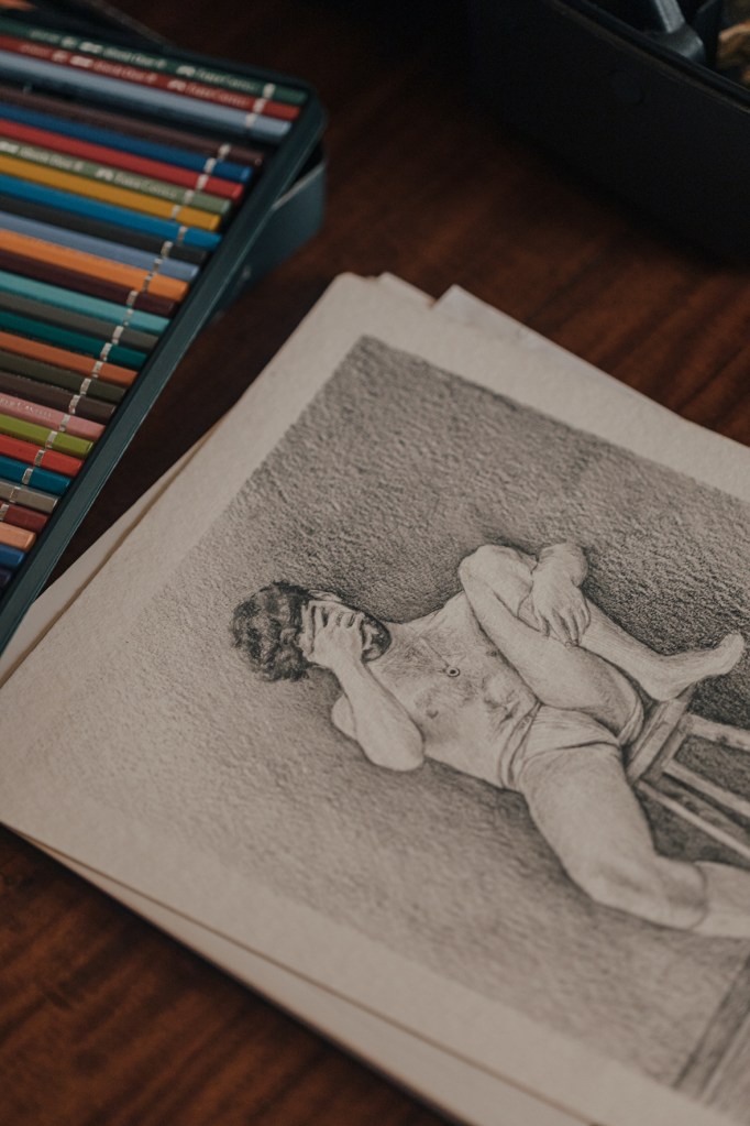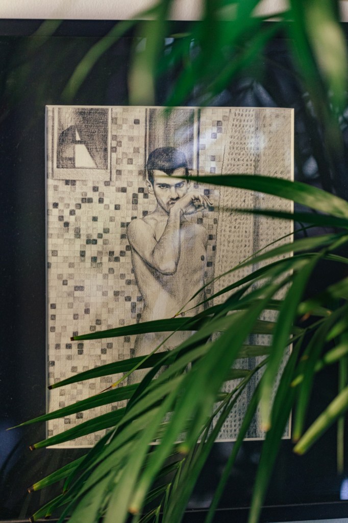 La pintura todavía sin terminar en su taller sigue el mismo hilo conductor, así como muchos de sus dibujos. Empieza por la foto y luego decide hacia qué medio llevarla. Disfruta trabajar con lápiz en dibujo y explorar colores fuertes y pálidos en pintura. Su taller es la habitación más luminosa de la casa. Hay cuadros de Héctor Delgado, Amadeo González y un par sin colgar de To+ Lab con su signo solar y lunar: Tauro y Piscis. Un elemento más del estudio es su moto: para Andrés, tal como la pintura, el vehículo se define como “un elemento más de independencia”.