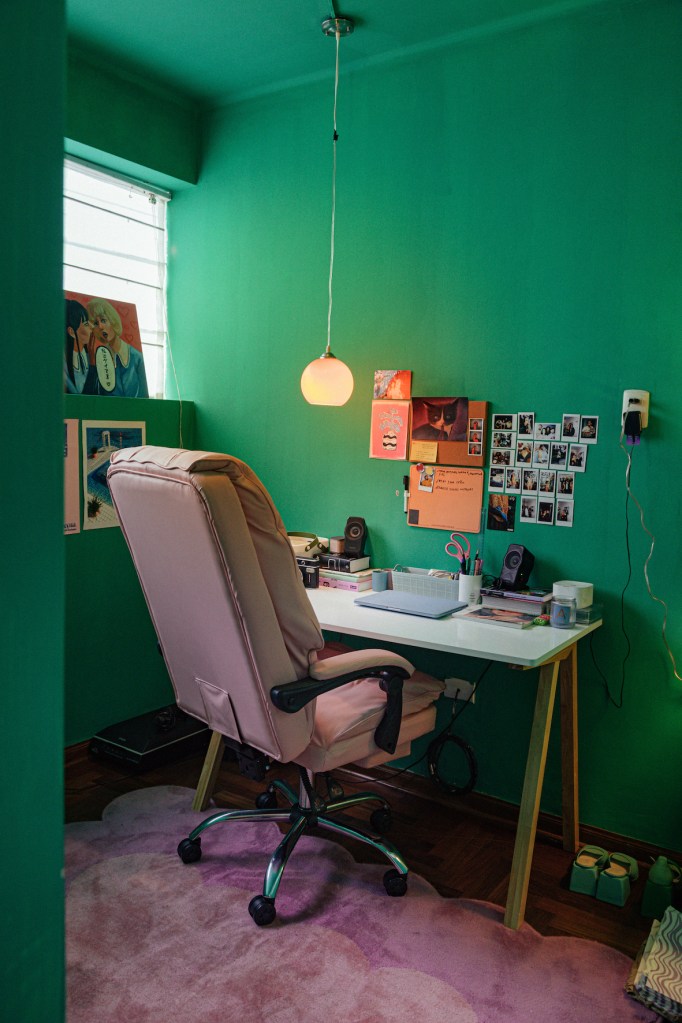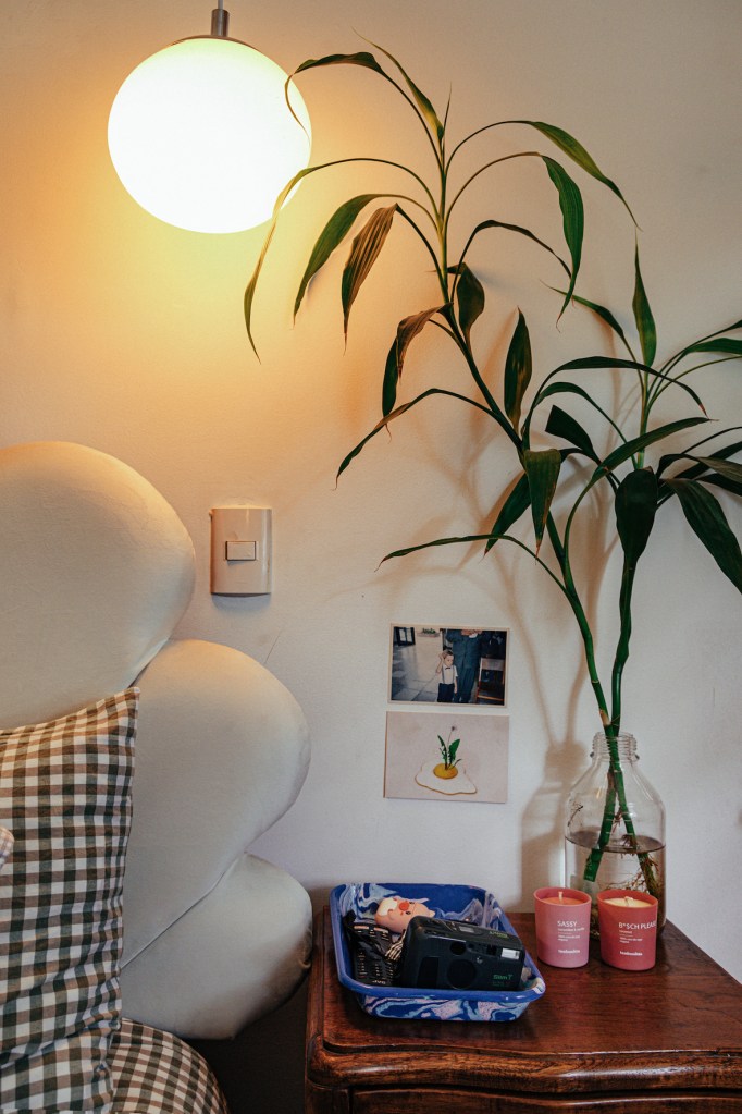 Pasa la mayor parte del día en casa. Usa mucho su escritorio para editar sus fotos y para empaquetar los pedidos de su marca de zapatos de autor, Eyna. El depa también es un punto de encuentro social: hasta hace poco, la cantautora Fernanda Perochena fue su roommate, y solían recibir a sus amigas dos o tres veces por semana. Richard, quien es músico, tiene su estudio cerca, y pasa por el departamento de lunes a viernes. Esta casa es el epicentro de la vida cotidiana y el trabajo de Deyna, un lugar donde la creatividad y la convivencia se entrelazan de manera natural.