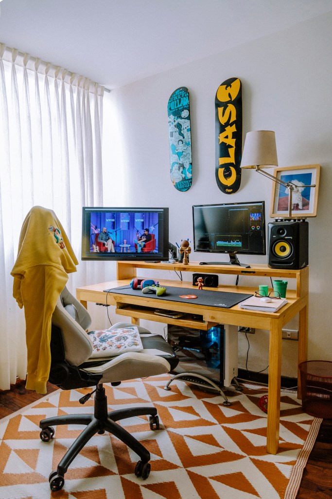 Christian pasa varias horas del día en su propio estudio. Su oficina, montada en una de las dos habitaciones que tiene este departamento, lo define. Hay una repisa de madera, que estaba previamente instalada y que cuando Luciana vio, exclamó: “Aquí entran todas tus cosas, Christian”. Basta con ver lo que hay allí para entender su lado más nostálgico: juguetes, desde las tortugas ninjas hasta los Kendamas, típicos de Japón. Un cuadro con sus entradas a conciertos, tocadiscos y vinilos del payaso Popy o las ediciones especiales de Wu-Tang Clan, uno de sus grupos favoritos. También hay un carné de BlockBuster, un Nintendo y consolas de PlayStation. Colgados en las paredes destaca un longboard, el primero que compró en la época que hacía downhill, y skates de las marcas de sus amigos.