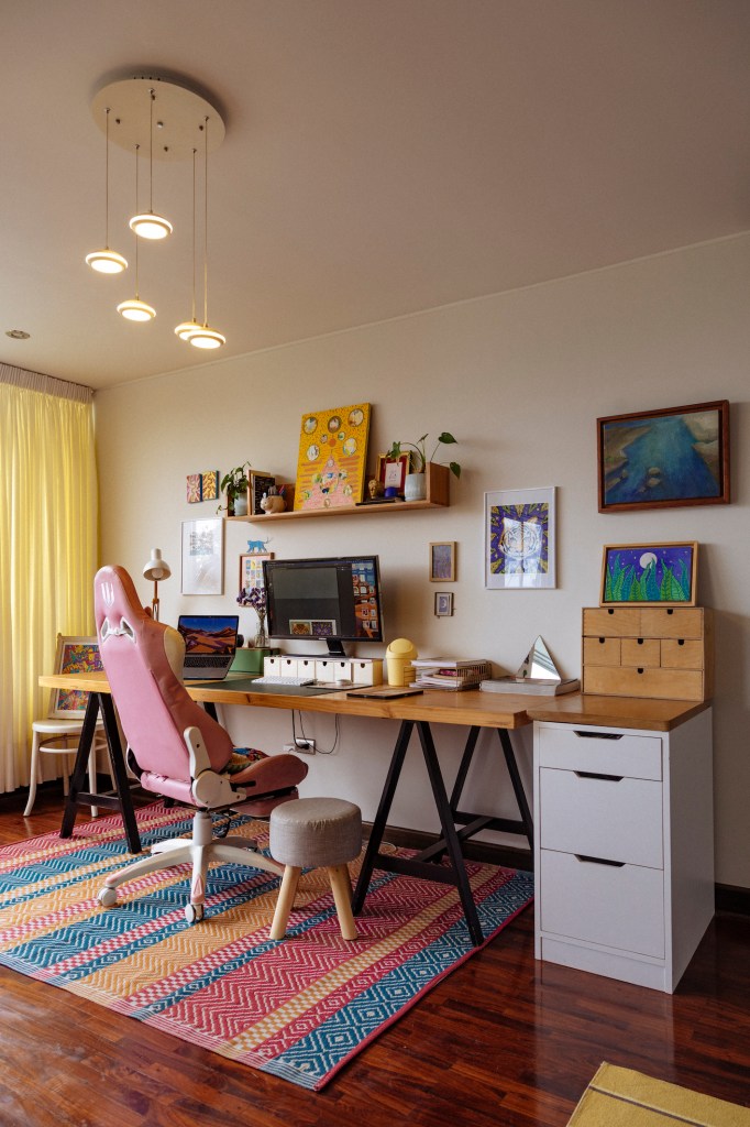 Ella ha montado su espacio de trabajo con una mesa que previamente fue parte de una escenografía; una silla gamer, que solo aceptó por su color rosado y porque tiene la palabra ‘Unlimited’; y piezas de arte, como la pintura de Alejandro Alayza que él le regaló en 1997, y un dibujo de su amiga, la artista Fátima Rodrigo. A veces, cuando la mente se lo pide, medita allí durante cinco minutos. Luego, empieza su día laboral.