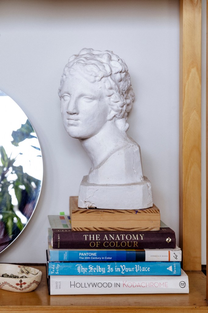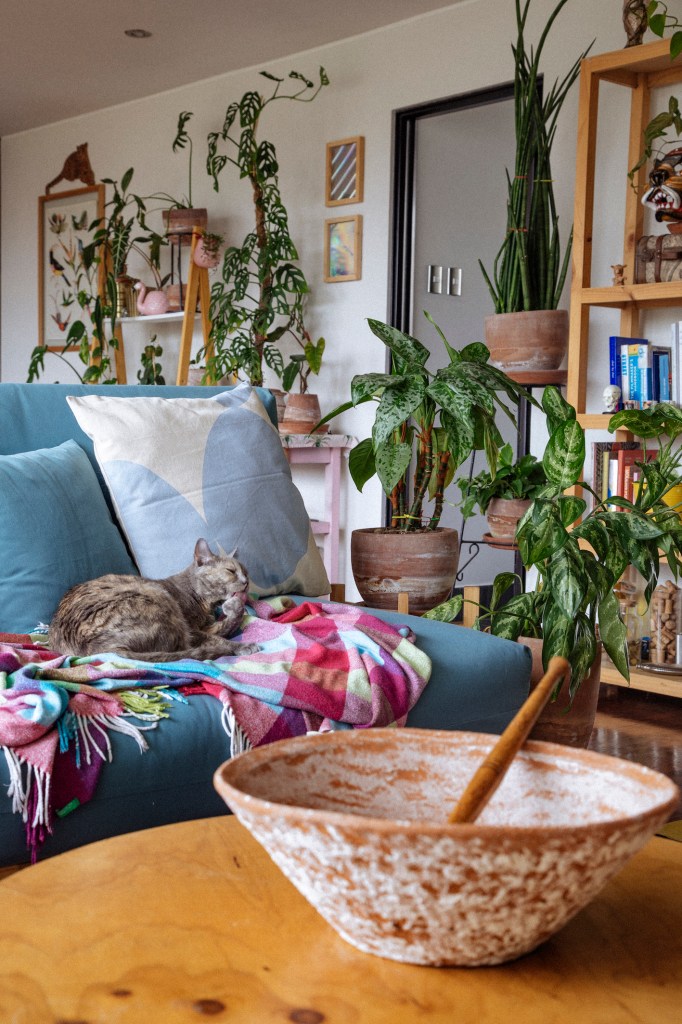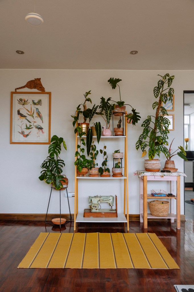 En profunda sintonía con la vista del parque, la casa está llena de plantas. Luciana se encarga de verlas y dibujarlas; Christian de investigar y cuidarlas. Él tiene una repisa dedicada a las plantas a las que les tiene más feeling. Solo ahí hay unas doce, entre monsteras, philodendron, alocasia y pothos. “Durante la pandemia, encontré en ellas la forma de estar en la calle sin estarlo y me volví un enfermo de las plantas. Para cuando nos mudamos, había aprendido lo suficiente sobre sus necesidades y es parte de mi rutina en casa”, cuenta.