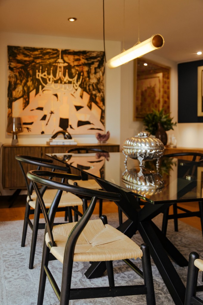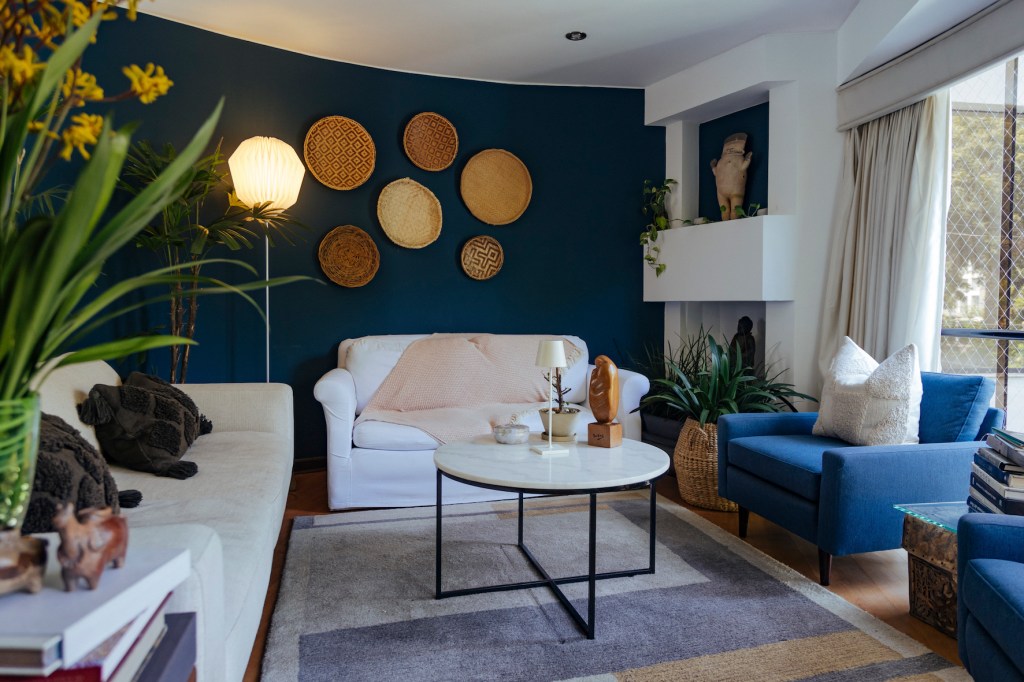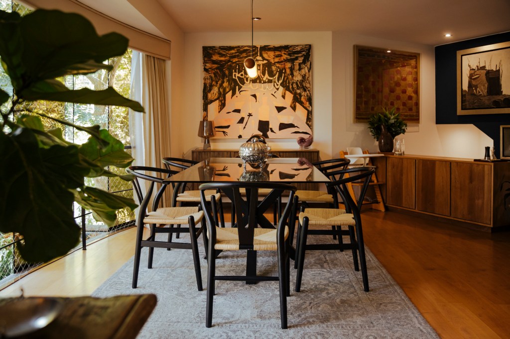 En la sala, querían que el sofá aproveche la vista la parque. La pared curva fue un reto: Jerónimo probó cuadros de diferentes tamaños, pero no funcionaban. Finalmente, tuvo la idea de mandar a hacer canastas a la comunidad Shipibo-Konibo de Cantagallo. Una suerte de recibidor/bar divide ese salón del comedor: ahí, una mesa andina que tiene entre 150 y 200 años –un regalo de la mamá del chef–, define el espacio. Son parte de la familia que aun mantiene la centenaria Casa Aliaga en el centro histórico, así que las antigüedades son parte natural del hábitat.