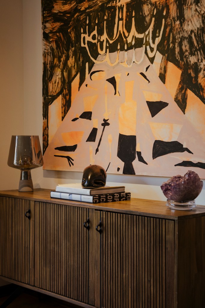 Debajo de la mesa del comedor hay una caja de pecanas, curiosa decoración que fue regalo de un tío que las cultiva y que también funciona como entretenimiento para Olivia, que ama sentarse en el piso y jugar. Las macetas que rodean la mesa tienen ruedas por practicidad, pero a medida que Oli empiece a caminar van a cambiarlas, para evitar accidentes. En la pared, un cuadro de Valentina Maggiolo representa también una mesa de comedor: “Buscábamos algo que dé profundidad, y este cuadro funciona como un espejo de la realidad”, explica la pareja.
