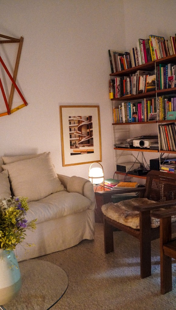 El salón quedó adentro, en un espacio más en penumbra. Y está bien así, porque Celia suele ver películas con su proyector en el sofá tipo cama que se mandó a hacer. Tiene varias lámparas de mesa y una nueva de pie, y juega con las alturas de la luz para no quitarle intimidad a este ambiente lleno de libros, arte y piezas de diseño que ha ido coleccionando desde que se mudó al depa. Muchas veces se queda dormida en el sofá de lo cómodo que es. Usa indefinidamente los espacios de la casa y su rutina no siempre es igual. Mandó a hacer los muebles pensando en eso.