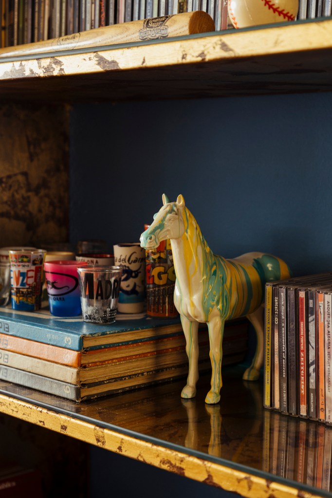 Muchos de los muebles recibieron un tratamiento wash (un look de madera gastada) y la mayoría están empotrados en las paredes, para regalar amplitud a la casa. Algunos muebles fueron dorados, como el que alberga la colección de CDs de Álvaro; se rescataron muchas piezas que estaban a punto de ser desahuciadas y que, en su lugar, recibieron una segunda chance para lucirse.