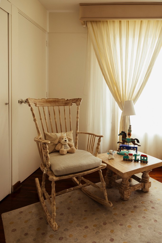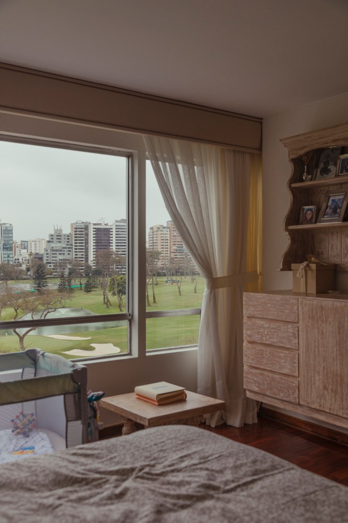 Su segundo bebé, de tan solo ocho meses, toma las siestas en una cunita al lado de la ventana del dormitorio principal. La luz lo arropa y se ve con claridad cómo es que el pequeño va cerrando los ojos, adormitado por la leche que cae del biberón. Al fondo, el paisaje verde acompaña los tonos neutros que caracterizan la zona privada, a diferencia de la saturación que existe en la parte social.