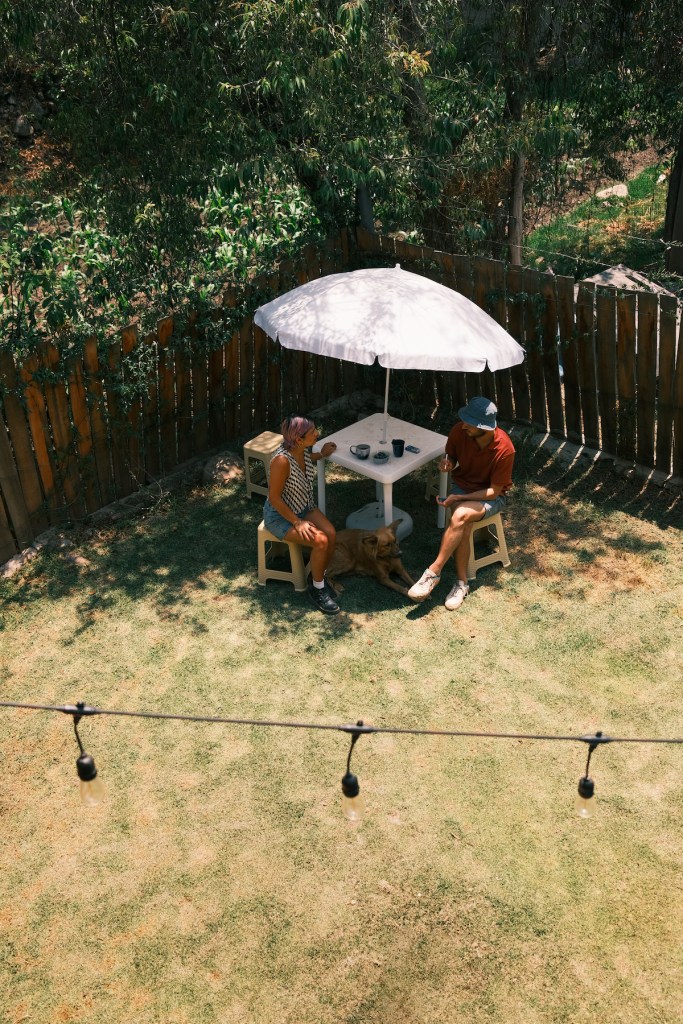 Tienen una cotidianeidad muy tranquila. Ella dicta clases a lo largo del día, y en sus descansos lee, estudia y toma sol; a él, como freelance, le tocan picos de trabajo intenso y otras semanas en las que tiene más tiempo para leer; pase lo que pase procura escribir. En su jardín frontal han puesto una piscina armable, un comedor y de vez en cuando se prestan una parrilla. La suya es la casa anfitriona; es donde caen todos sus amigos, que son también sus vecinos.